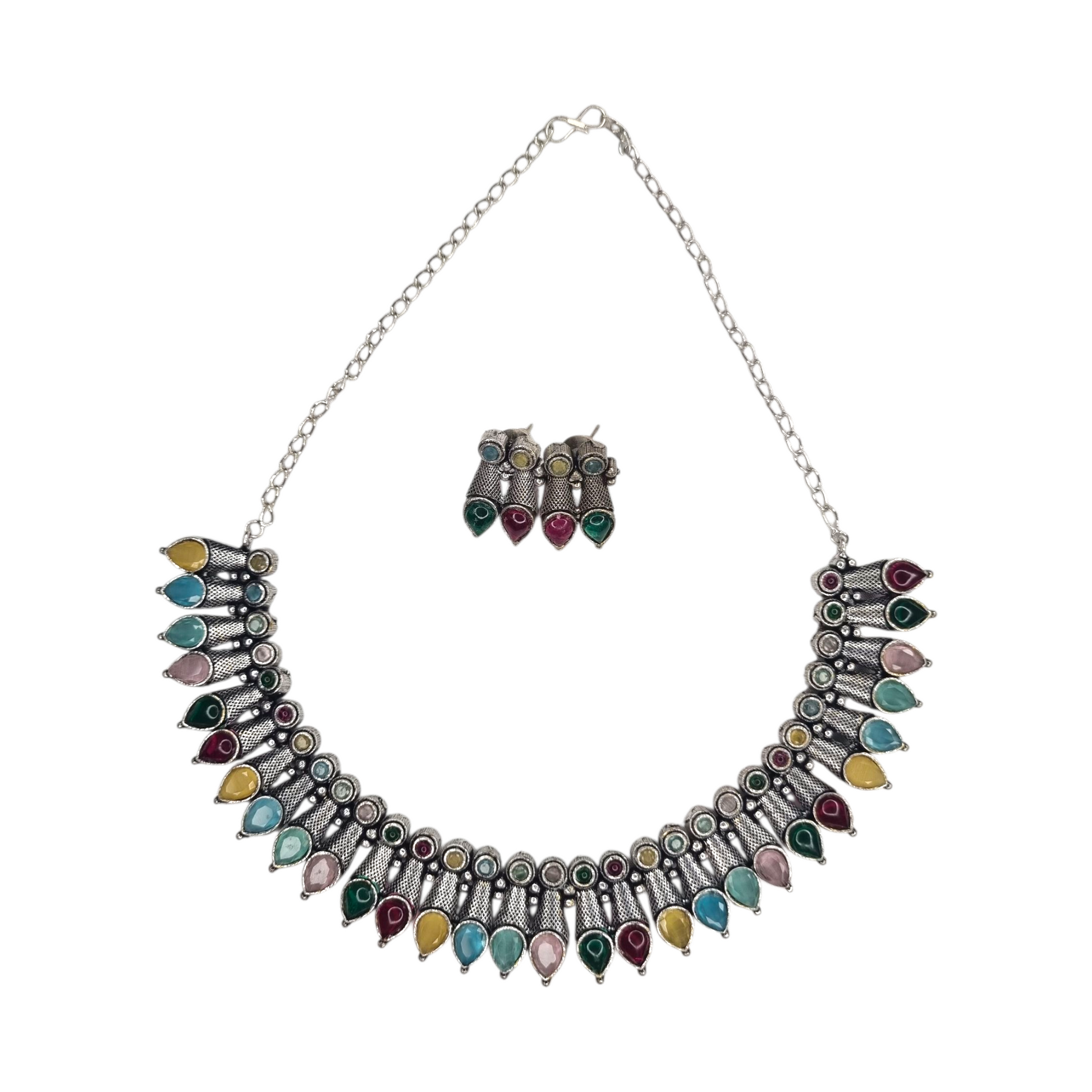Brighten your ethnic look with this vibrant multicolor oxidized necklace set crafted from durable brass metal. Featuring a radiant arrangement of colorful glass stones in pink, green, blue, yellow, and pastel hues, this choker-style necklace is paired with matching statement earrings. The antique silver finish adds a rustic tribal charm, perfect for festive occasions, Navratri, or Indo-western fusion looks.