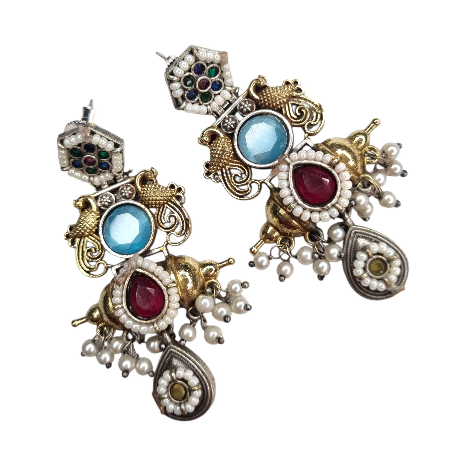 Add a touch of royal elegance to your collection with these ethnic statement earrings featuring stunning Ruby Monalisa stones, vibrant turquoise accents, and intricate antique gold-silver detailing. Finished with delicate pearl danglers and traditional motifs, these earrings are the perfect accessory for weddings, festivals, and cultural occasions.