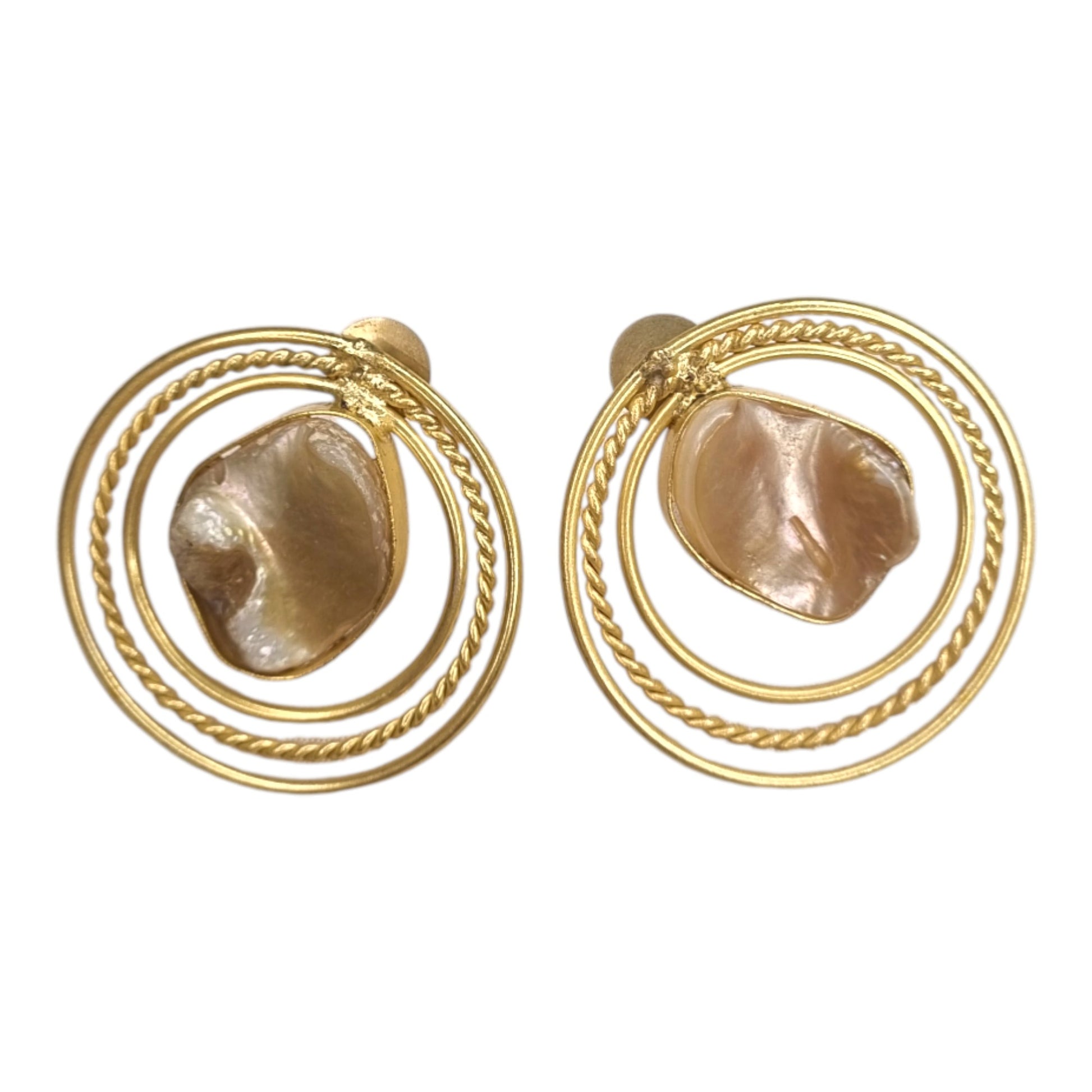 Elevate your style with these stunning earrings, featuring a unique blend of modern design and natural elegance. Each earring showcases a delicate, irregular piece of iridescent mother-of-pearl, beautifully nestled within a series of concentric golden circles. The outer circles are crafted with a twisted rope design, adding texture and visual interest, while the inner circles provide a smooth, polished contrast.