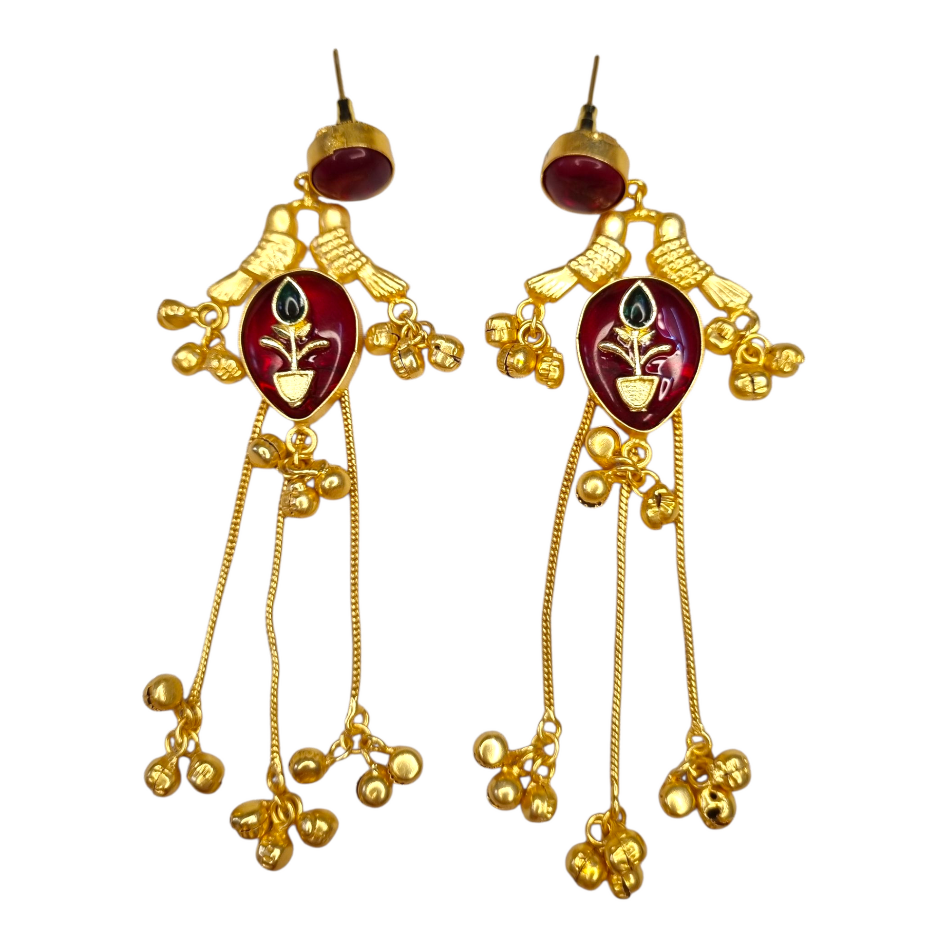 Bring a touch of heritage to your style with these Kashmiri Long Dangler Earrings, crafted from high-quality brass and embellished with a striking red enamel floral motif. The delicate golden chains with ghungroo-style drops add movement and charm, making these earrings perfect for weddings, festivals, and cultural occasions.