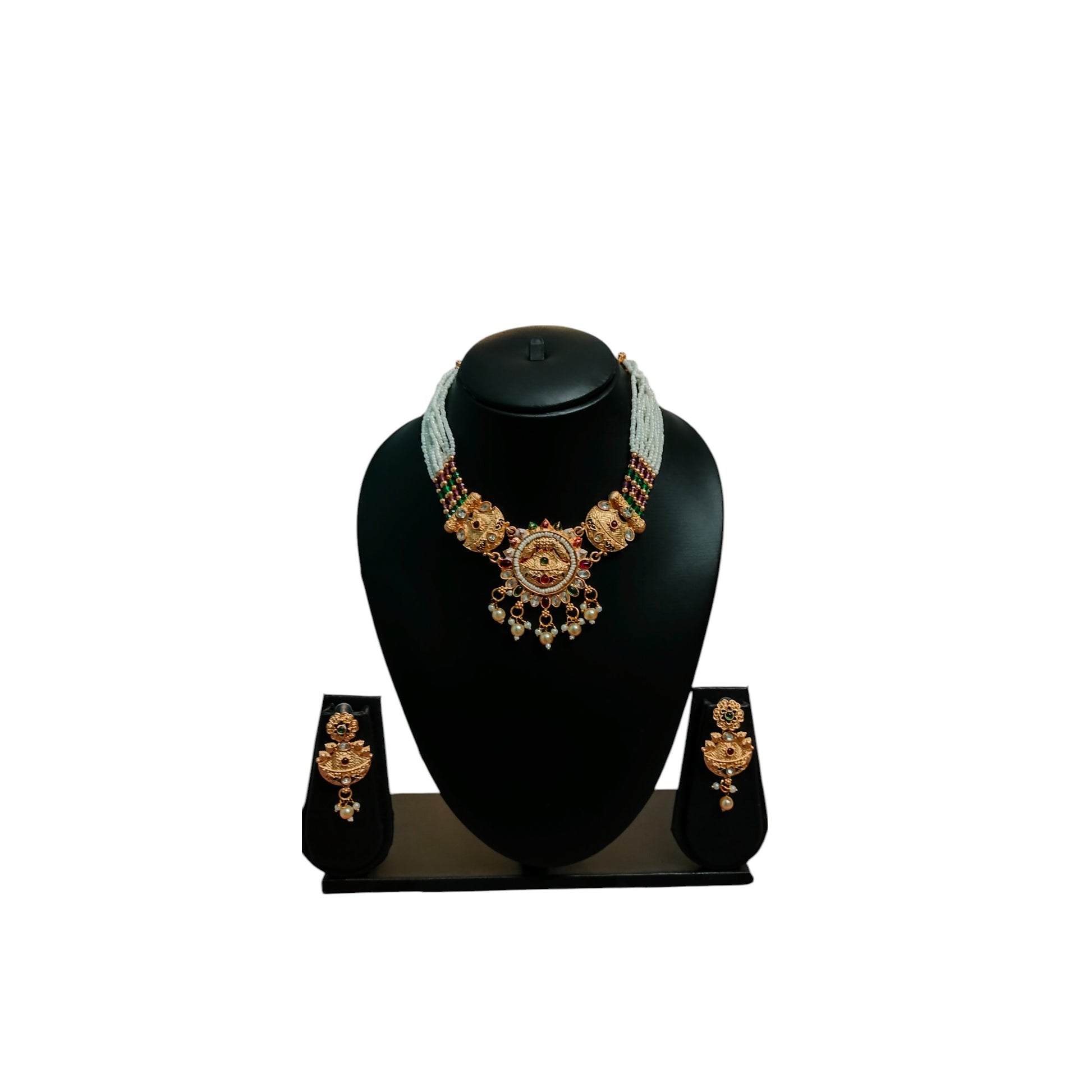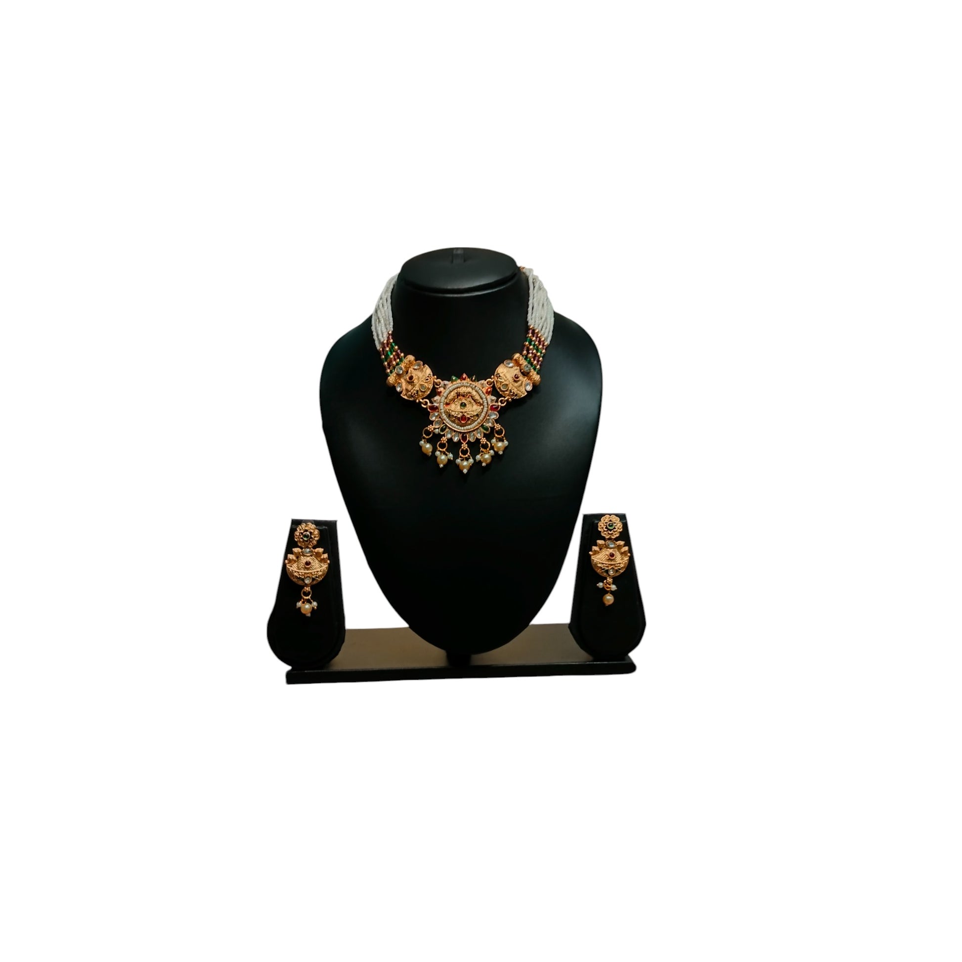 Add a regal touch to your jewellery collection with this handcrafted temple-inspired necklace by Sajobhi. Designed with traditional motifs, antique gold plating, and delicate pearl danglers, this piece blends heritage craftsmanship with timeless elegance.