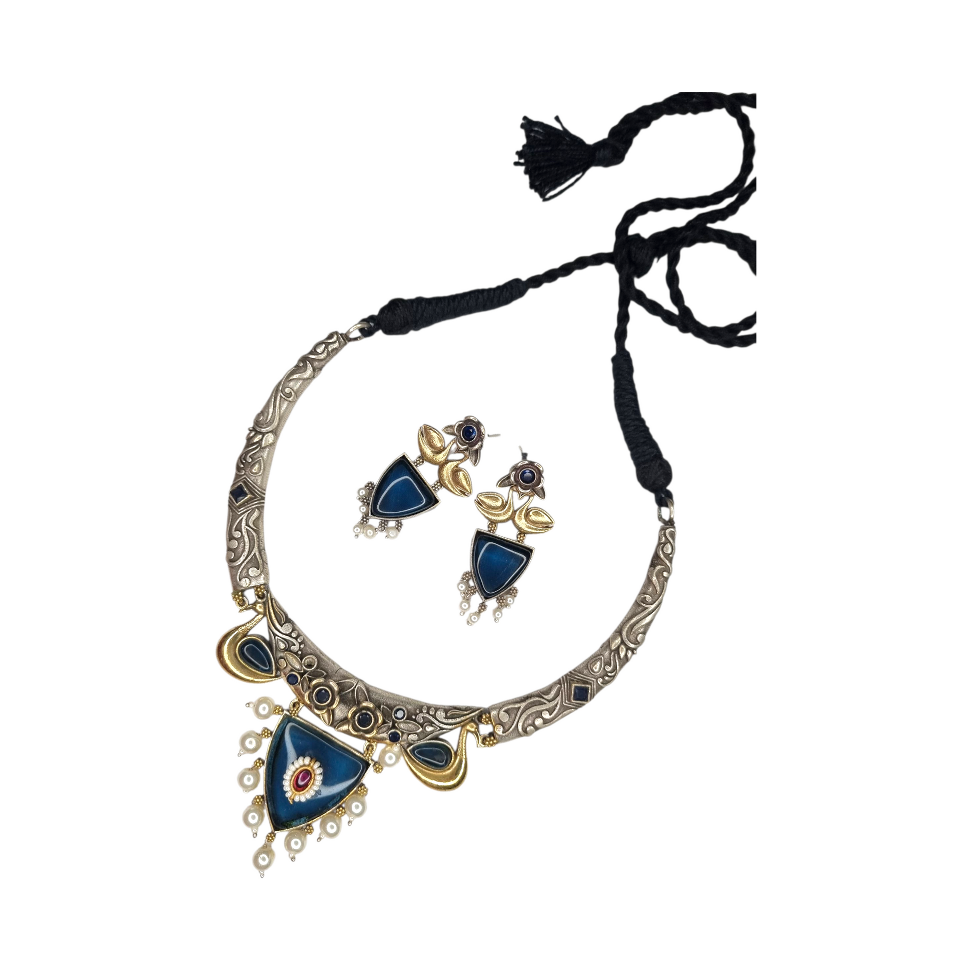 Elevate your ethnic and fusion wear look with this striking Bohemian Tribal Oxidized Silver Necklace Set featuring deep navy blue enamel work, antique gold accents, and artistic patterns. This set includes a beautifully crafted choker-style necklace with adjustable thread closure and matching designer earrings.