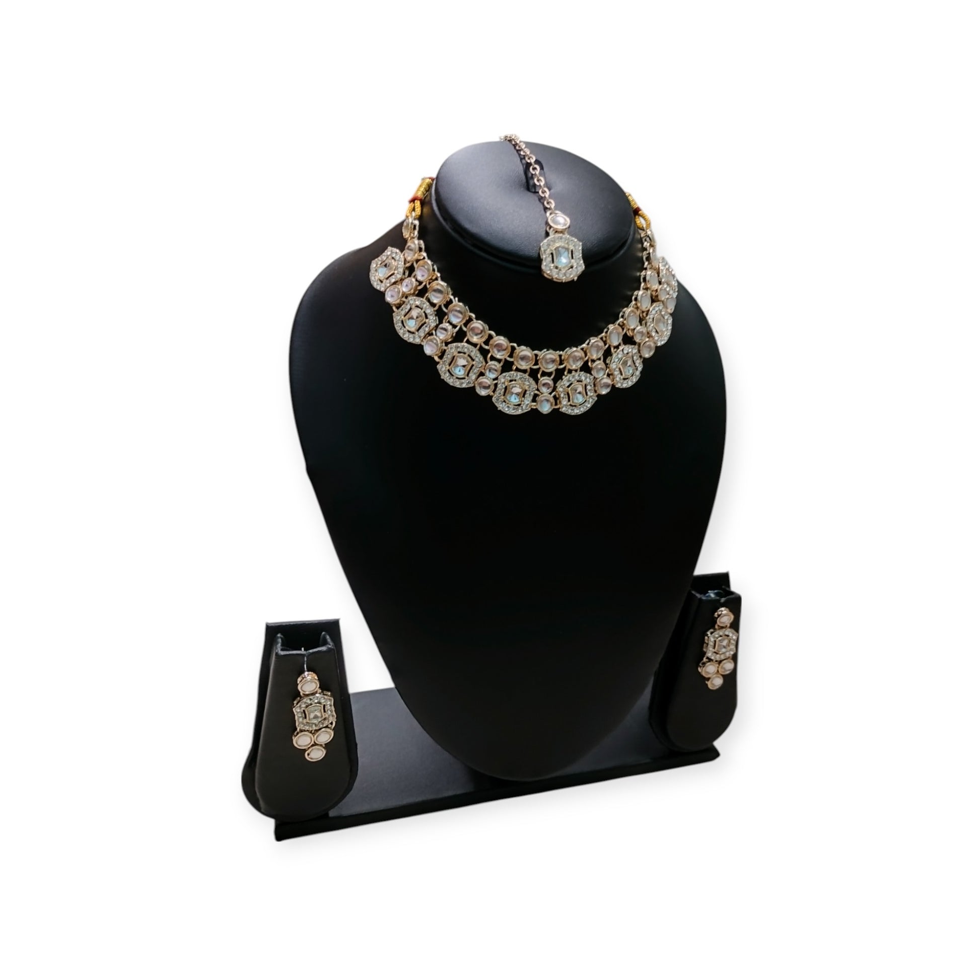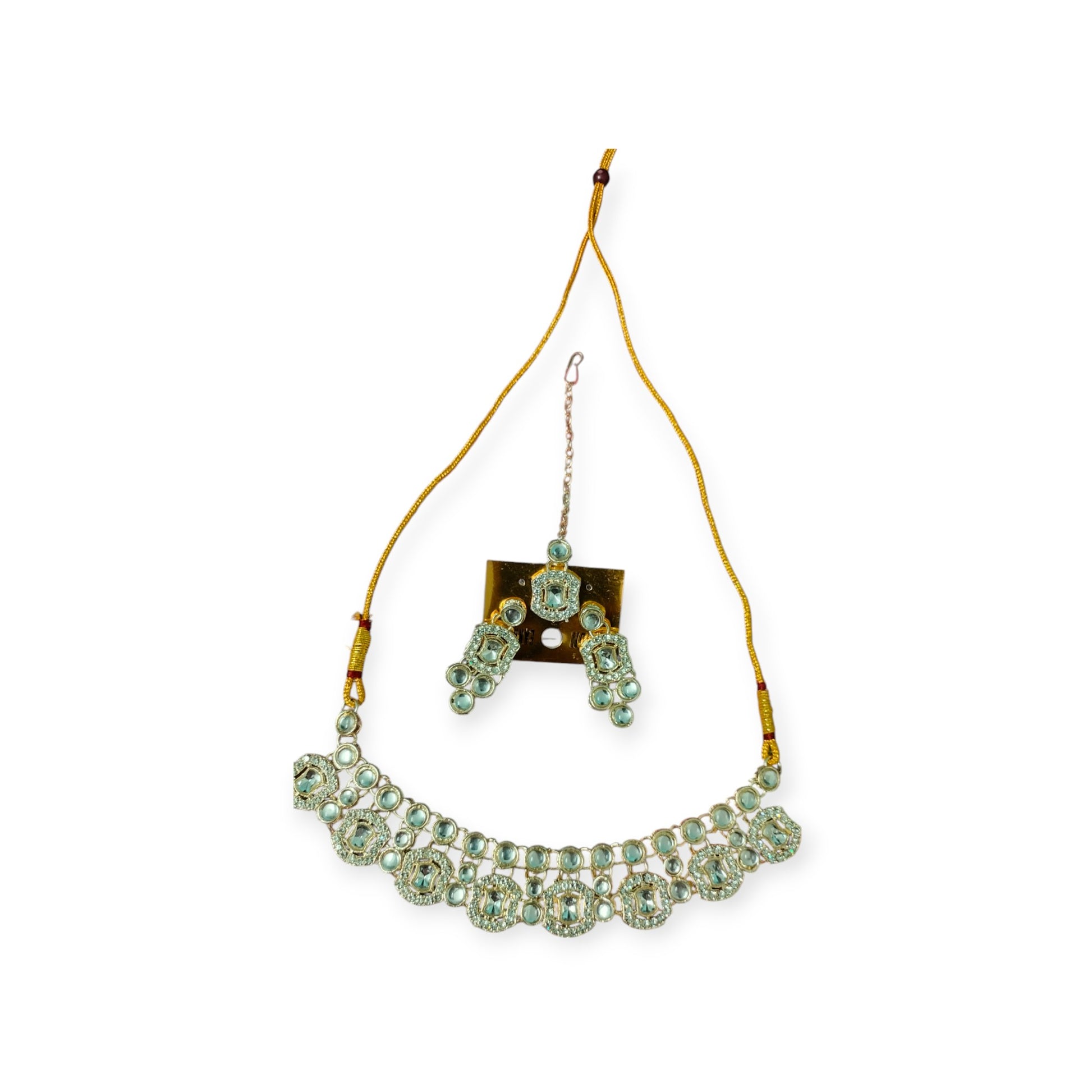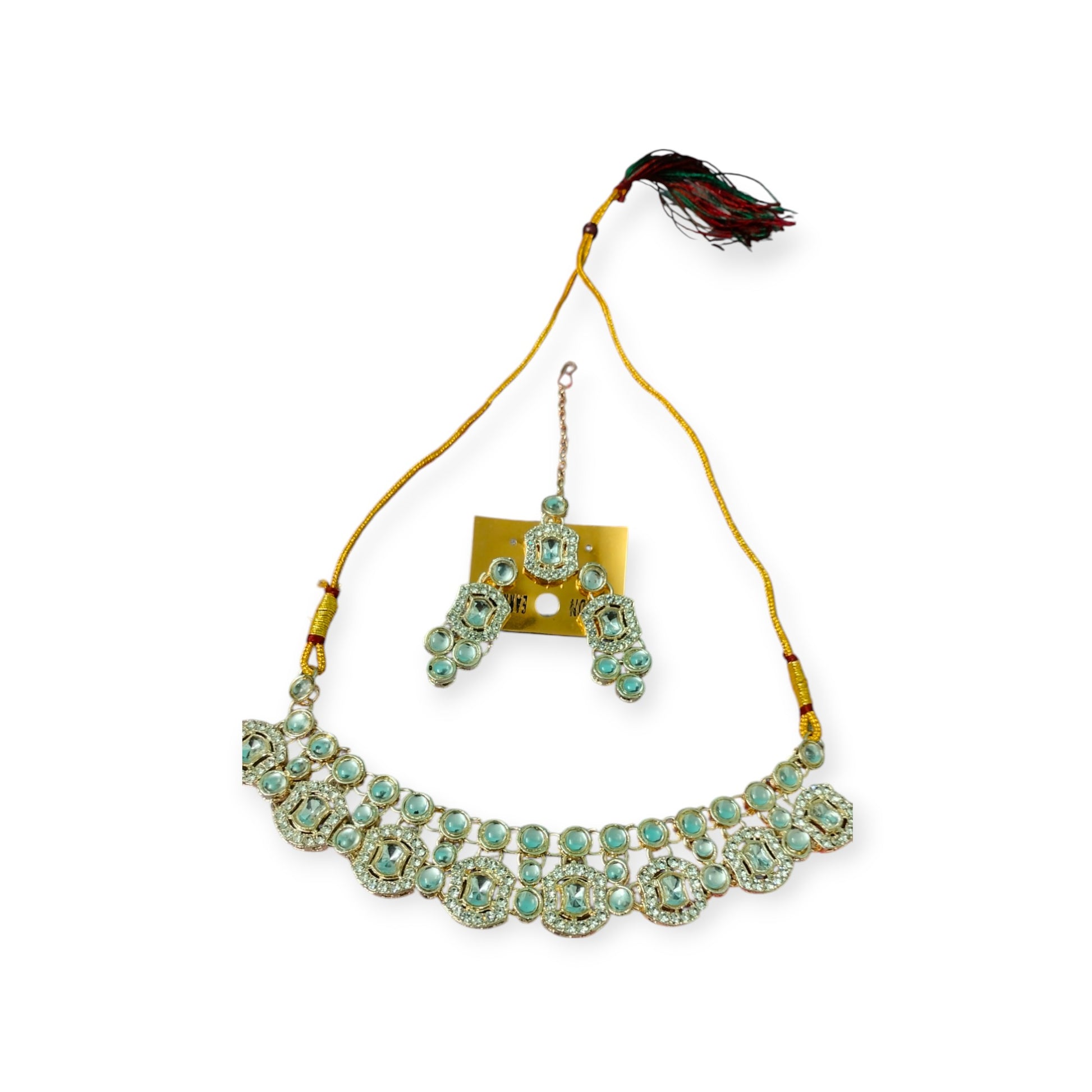 Make a majestic statement with this Aqua Kundan Bridal Set by Sajobhi — a beautiful fusion of tradition and modern glamour. Featuring an intricately crafted choker-style necklace with matching earrings, this pastel beauty is perfect for pre-wedding celebrations or festive evenings.