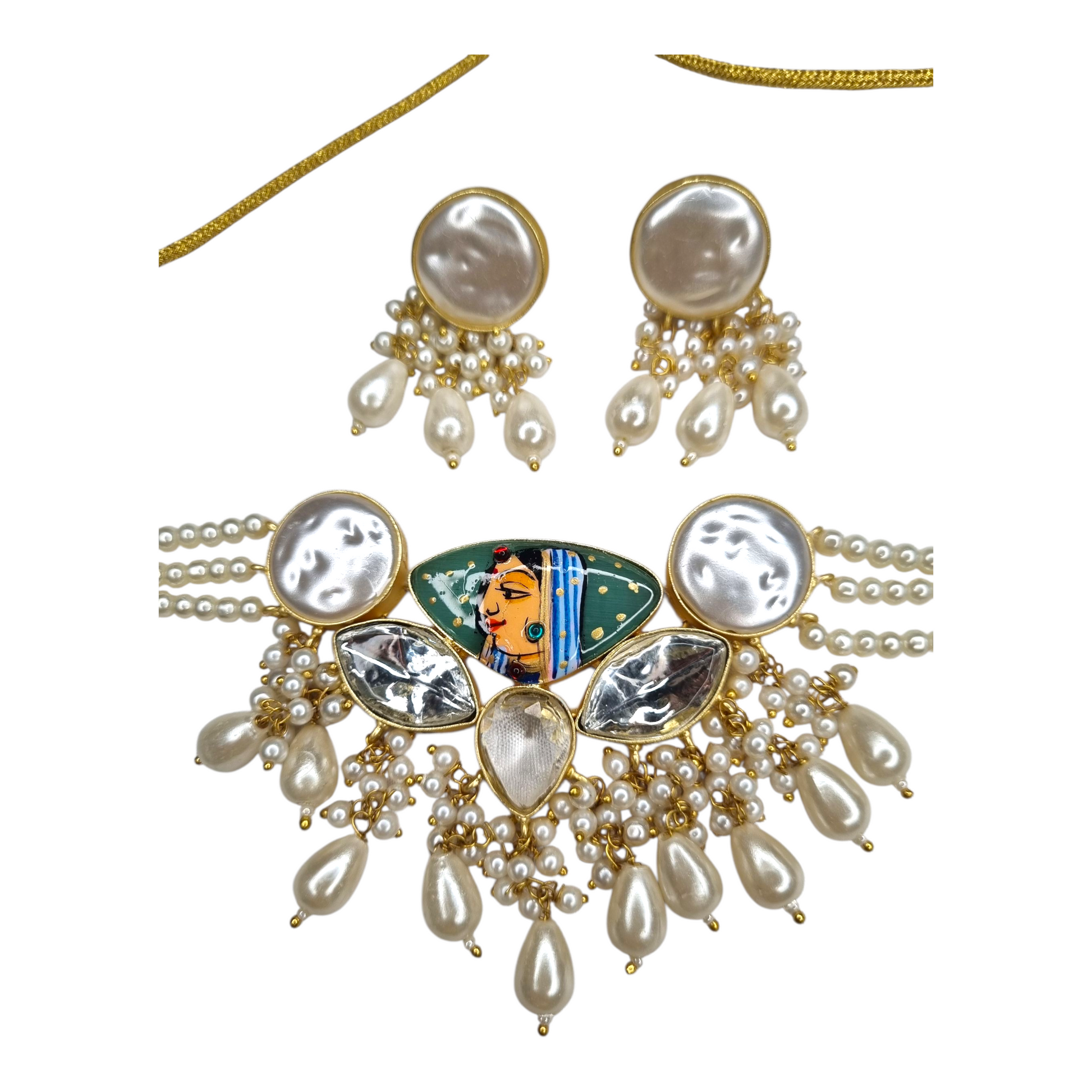 Traditional Brass Pearl & Kundan Necklace Set with Hand-Painted Pendant – Women’s Indian Jewelry