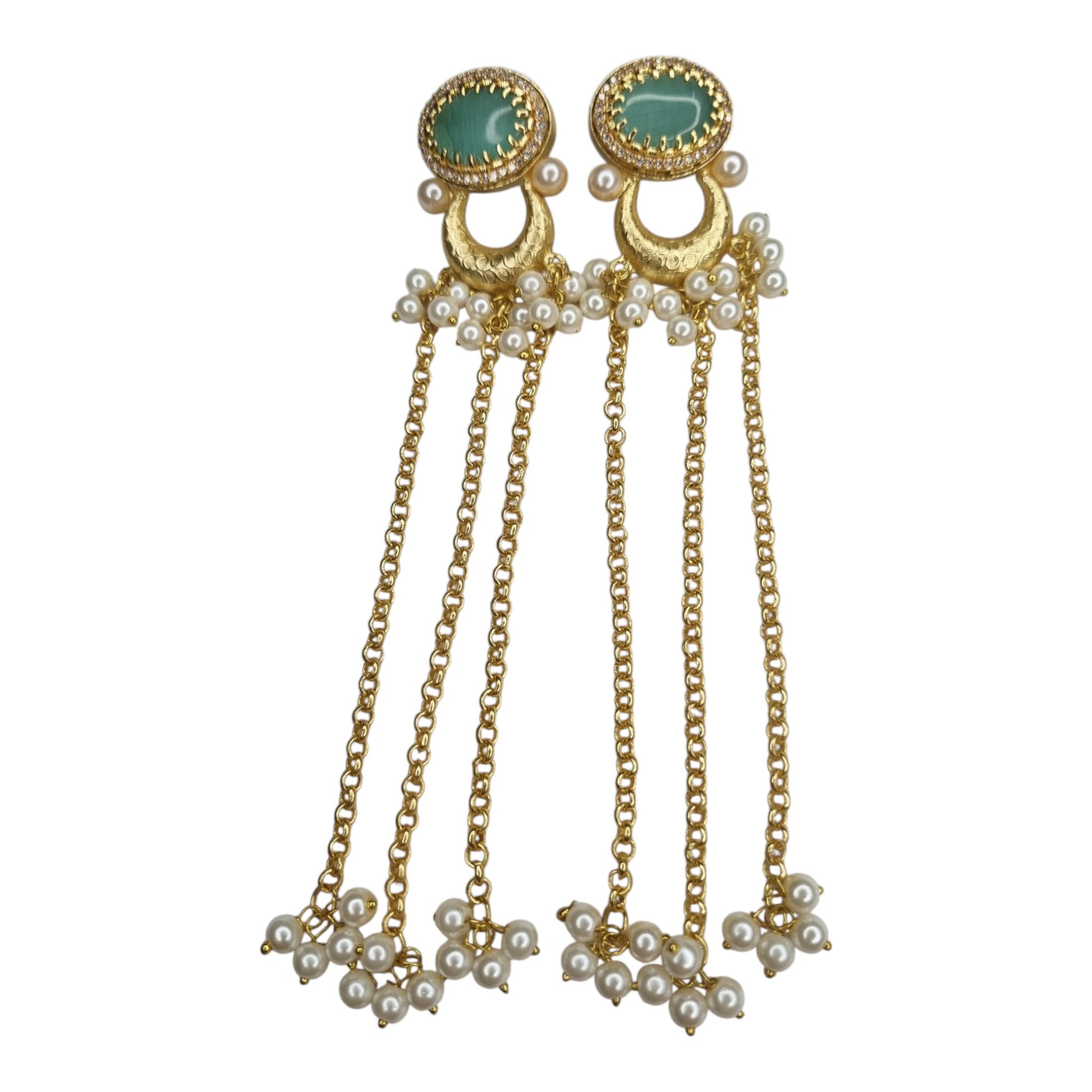 "Discover timeless beauty with our Traditional Indian Gold-Plated Chandbali & Pearl Dangler Earrings. These stunning pieces combine a rich emerald green oval stone with sparkling accents, leading to a classic chandbali (crescent moon) base embellished with dainty pearls. What truly sets them apart are the multiple long, delicate chains adorned with lustrous pearls, creating an enchanting flow that adds grace and movement. These earrings are designed to capture attention, reflecting the grandeur of traditional Indian jewelry. Ideal for brides, bridesmaids, or anyone looking to add a touch of royal elegance to their attire."