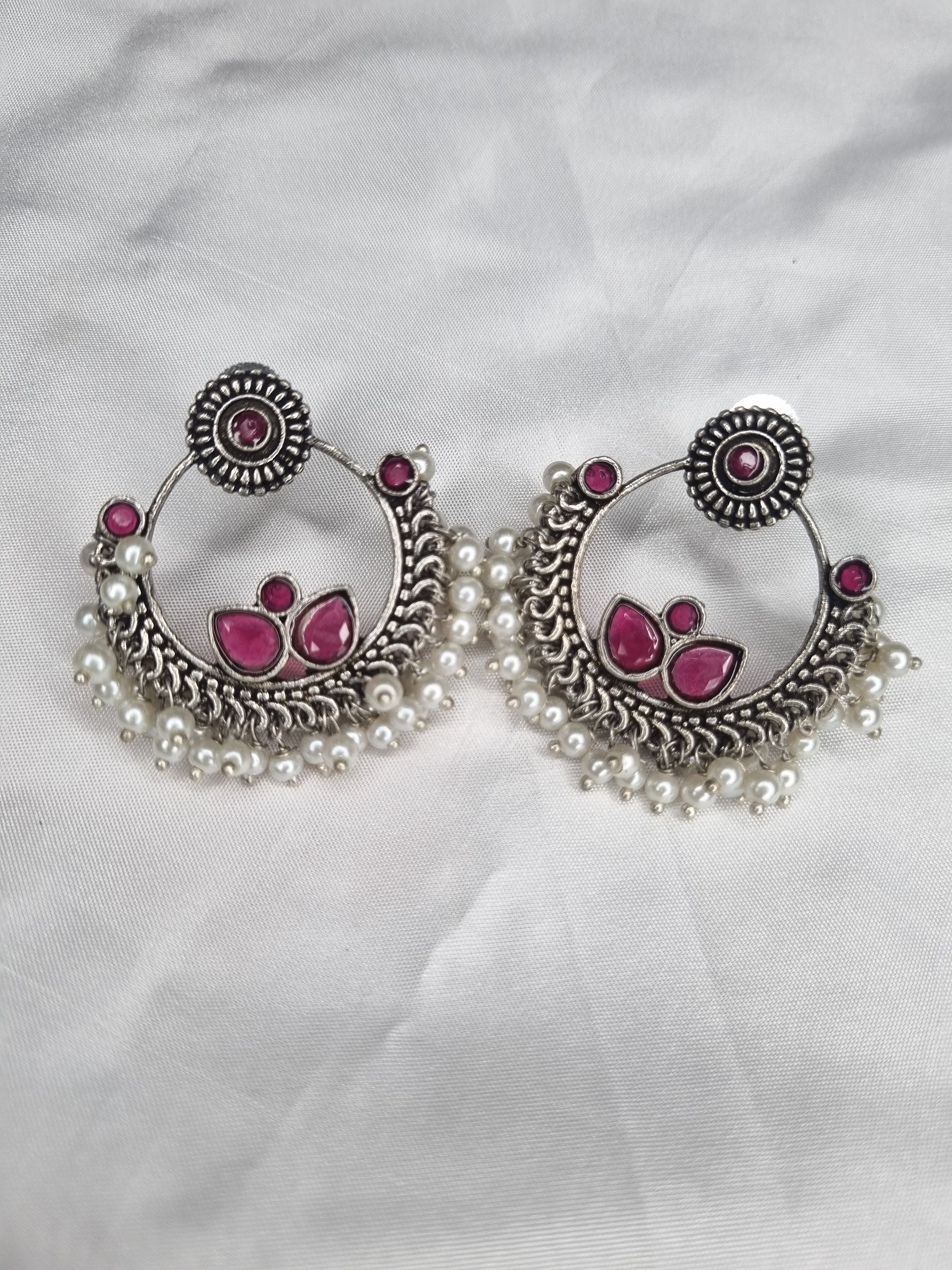Crafted with an authentic oxidized silver-tone finish, each earring features intricate detailing along its crescent shape. The highlight is a dazzling array of vibrant pink/magenta stones, meticulously set within the design, adding a rich burst of color. Dainty white faux pearls gracefully dangle along the lower rim, creating a classic, ethereal movement. The stud portion boasts a charming floral motif, ensuring a secure and stylish fit.