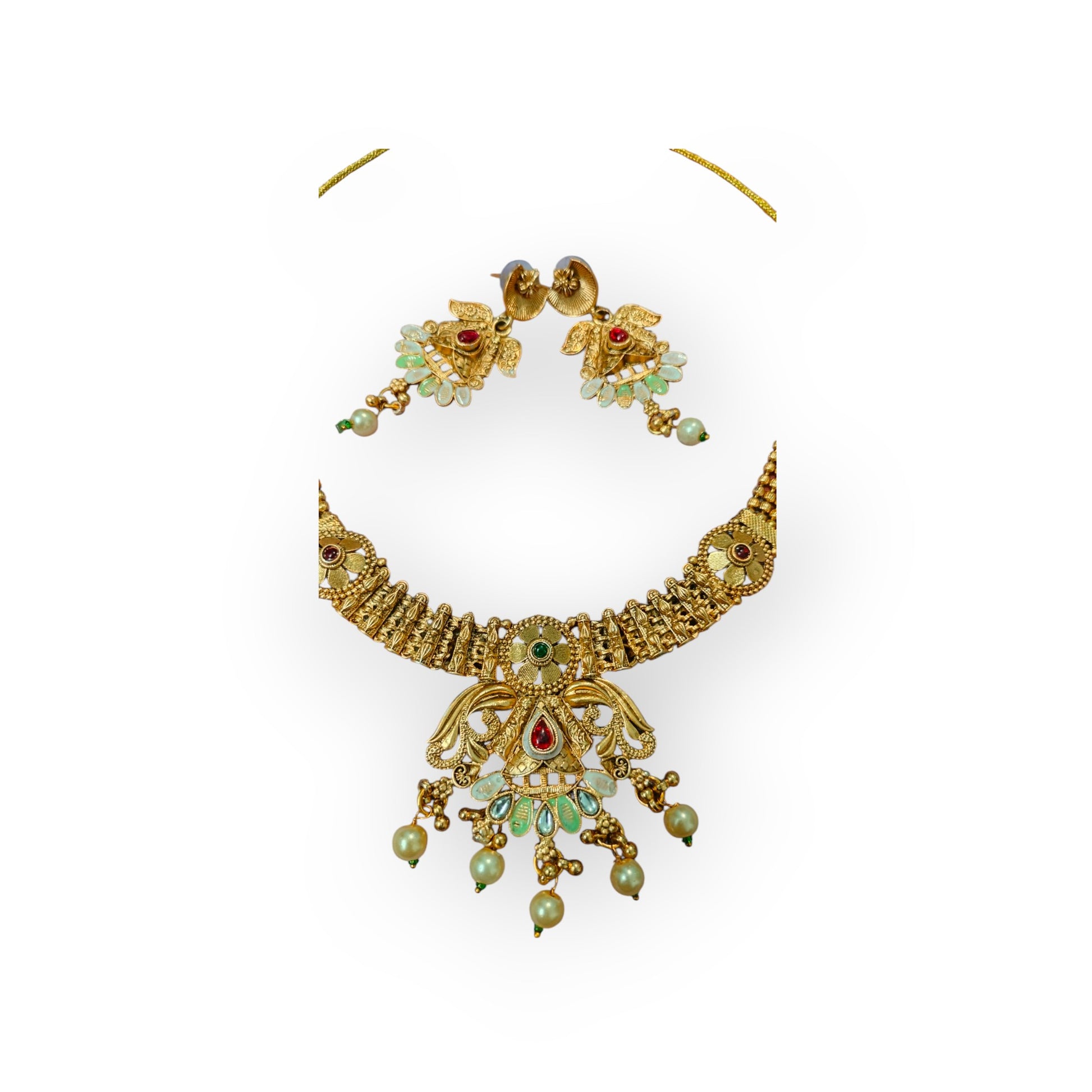 Traditional Matte Gold Temple Necklace Set with Earrings