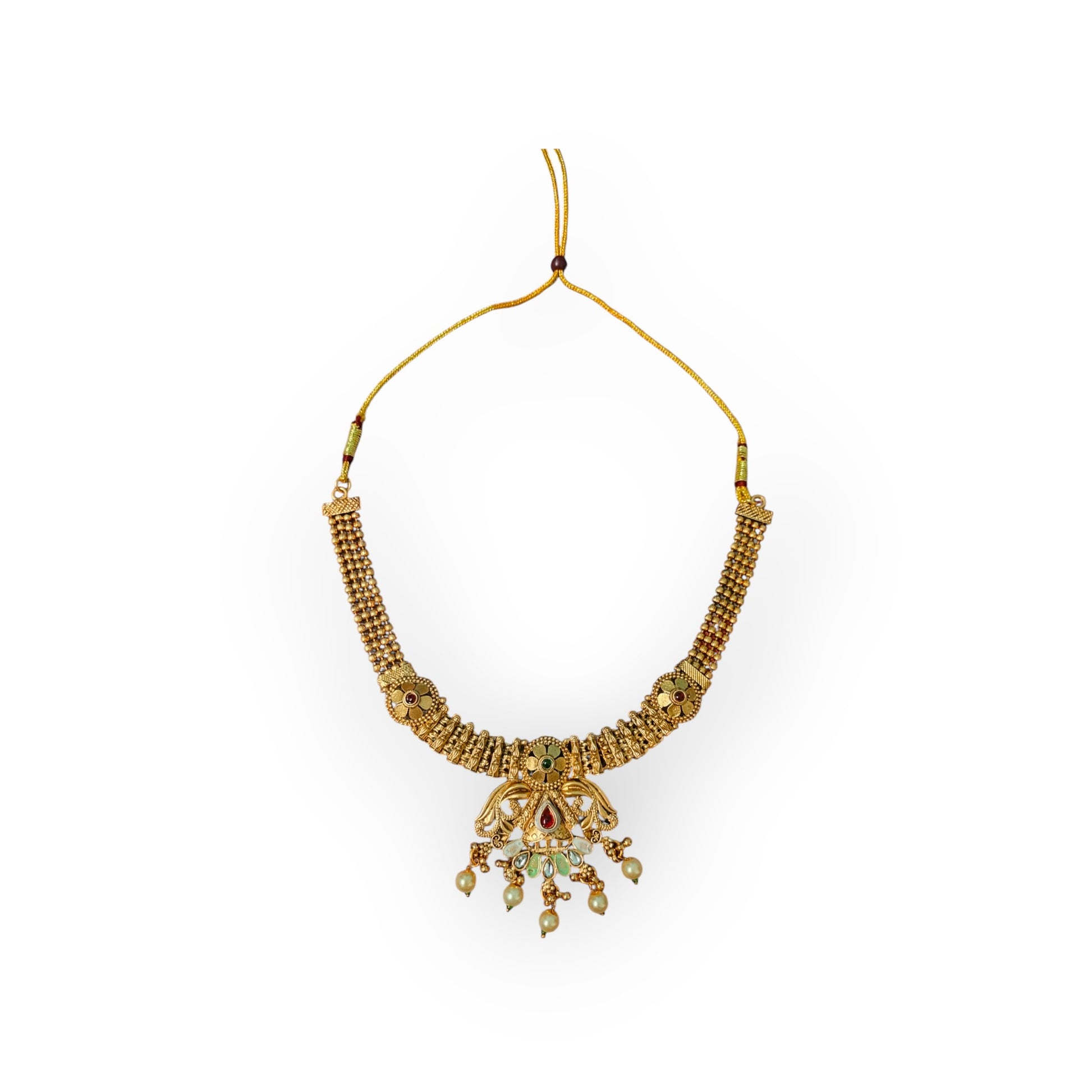 Step into timeless elegance with this traditional matte gold temple necklace set, crafted with intricate South Indian design elements. Featuring a bold central pendant adorned with ruby-colored stones, kundan detailing, and dangling pearl-like beads, the necklace exudes divine charm. Paired with matching jhumka-style earrings, this set is perfect for weddings, religious ceremonies, and festive celebrations. Designed to complement sarees and lehengas, this heritage-inspired jewelry set brings a royal touch to your ethnic ensemble.