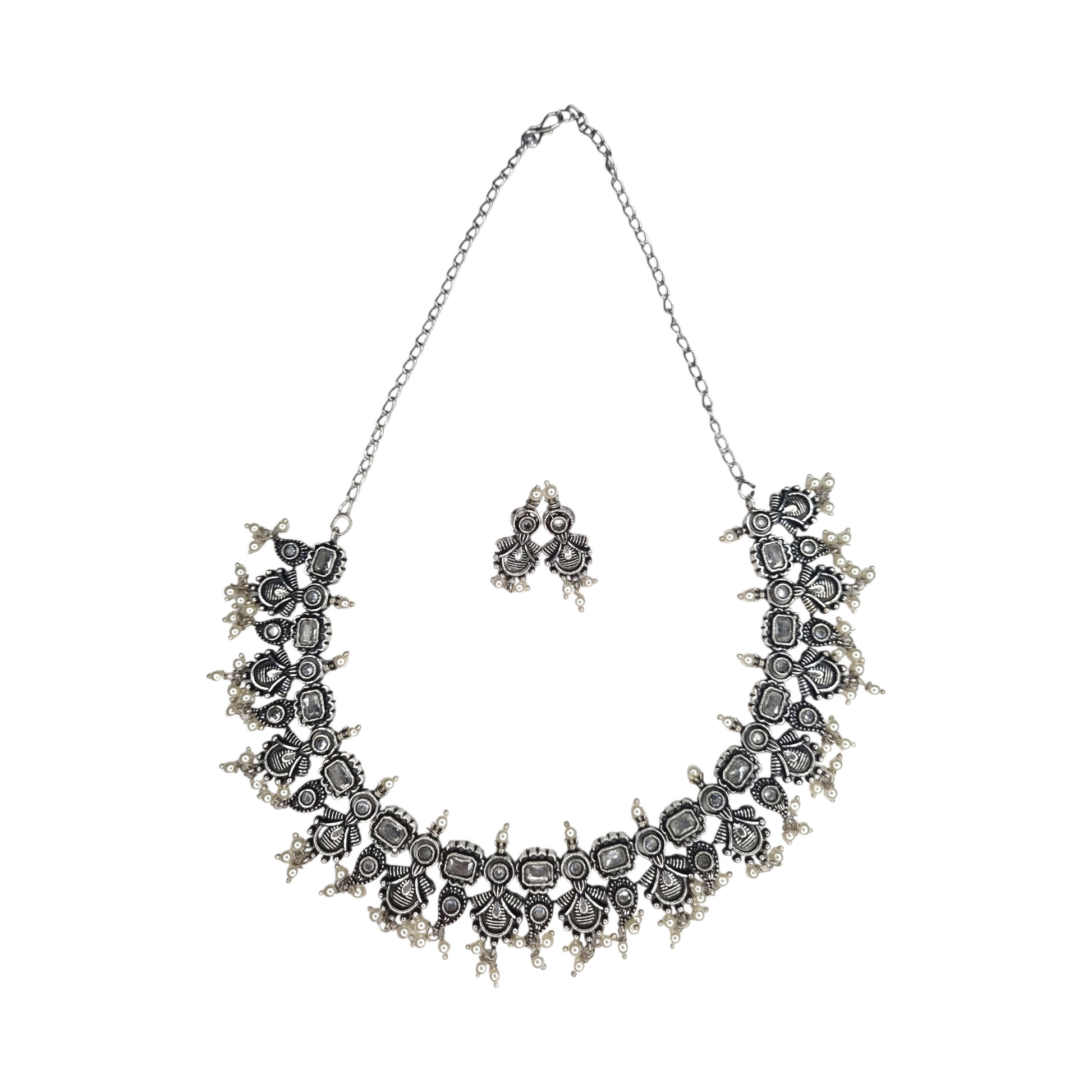 Vintage Oxidized Silver Necklace Set with Earrings – Ethnic Boho Design